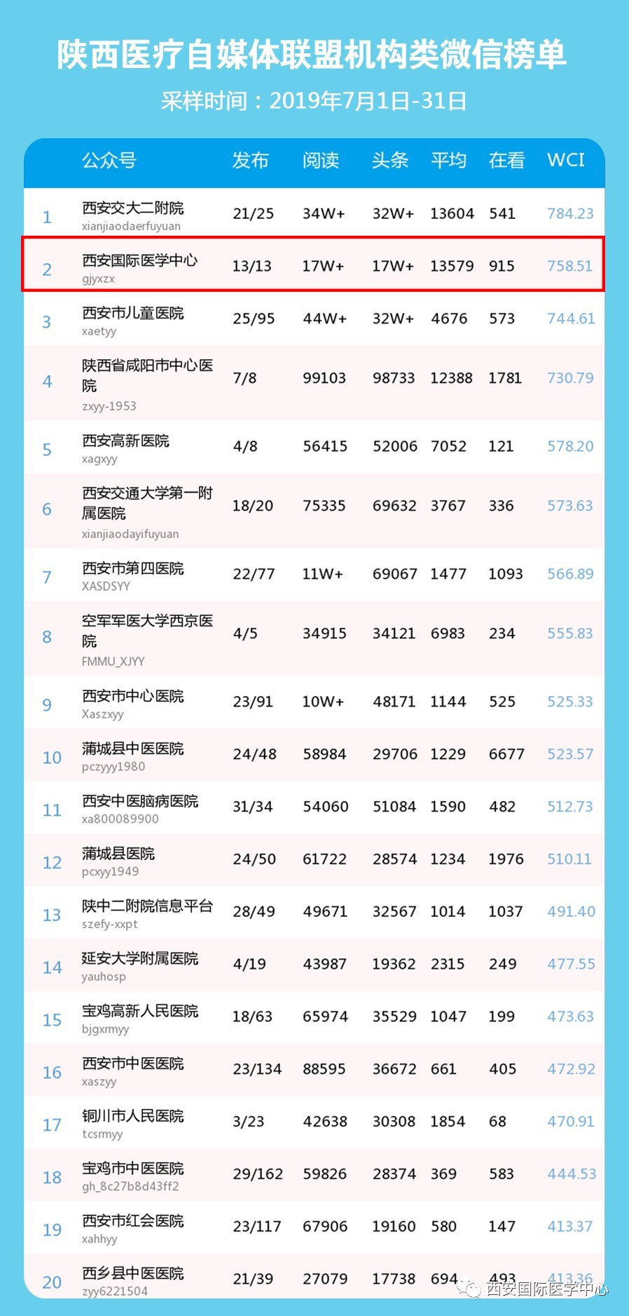 8月2日,中國醫(yī)療自媒體聯(lián)盟陜西分盟醫(yī)療機構(gòu)類微信公眾號7月份排行榜發(fā)布,西安國際醫(yī)學(xué)中心微信公眾號奪得醫(yī)療機構(gòu)類榜單第2名,高居“榜眼”。在陜西醫(yī)療自媒體聯(lián)盟的推薦下,西安國際醫(yī)學(xué)中心順利進入今日頭條號(醫(yī)療機構(gòu)),微信文章將同步刊登到今日頭條。