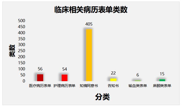 根據(jù)JCI第六版評(píng)審標(biāo)準(zhǔn),完成JCI相關(guān)醫(yī)療病歷表單類(lèi)56類(lèi),JCI相關(guān)護(hù)理病歷表單54類(lèi)、知情同意書(shū)405類(lèi)、告知書(shū)22類(lèi)、輸血類(lèi)表單6類(lèi)、麻醉類(lèi)表單15類(lèi),總計(jì)583類(lèi)。如圖所示: