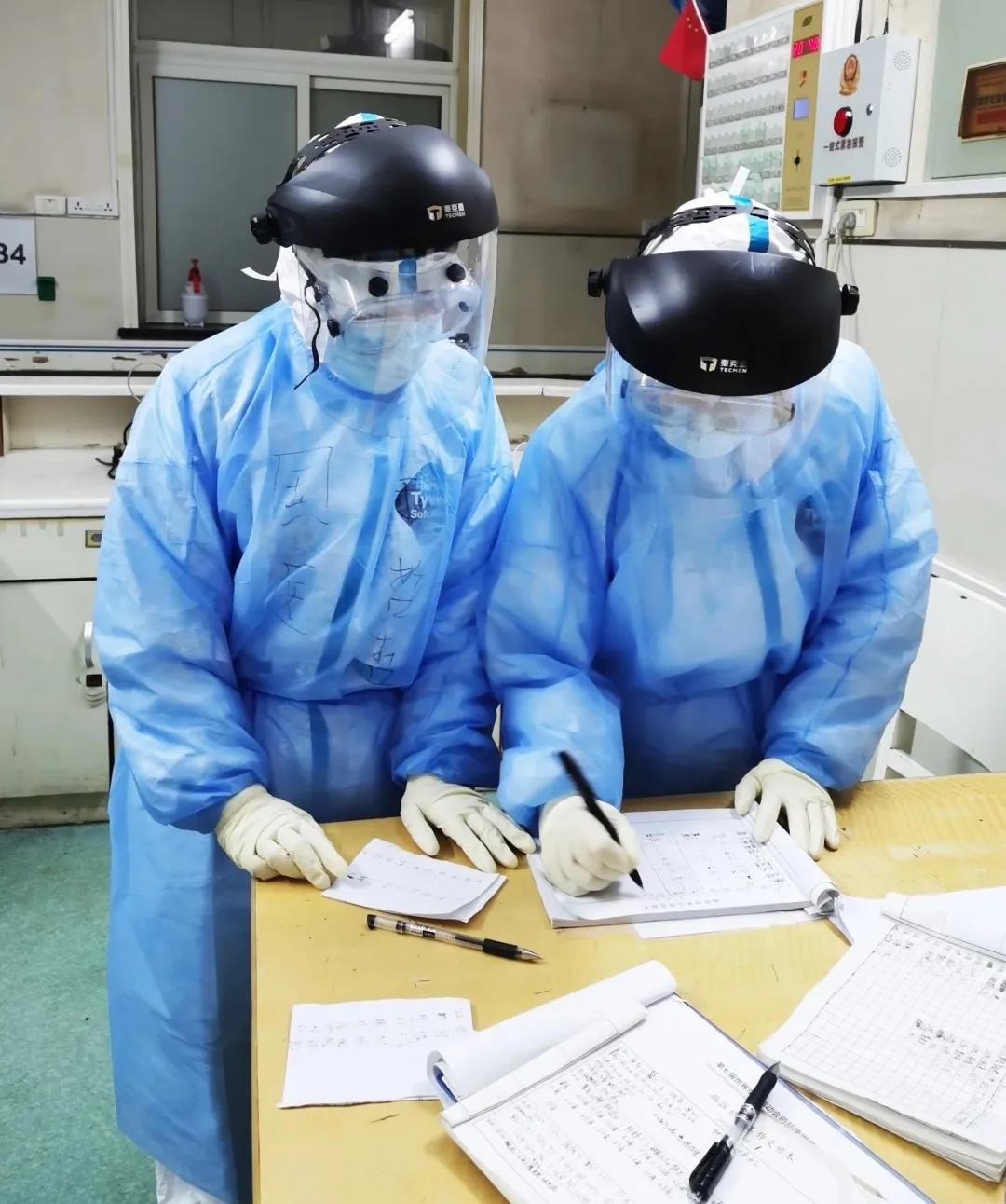 在抗“疫”工作中,她們一邊用精湛的護(hù)理操作技術(shù)為患者減輕病痛的折磨,一邊用溫暖貼心的話語增加患者戰(zhàn)勝疾病的信心。穿著厚重的防護(hù)服、隔離衣,戴著護(hù)目鏡、面屏、3層手套為患者穿刺留置針,取咽拭子標(biāo)本,抽取血標(biāo)本,氧氣吸入,口服藥發(fā)放,醫(yī)囑的處理,床單元的消毒……這就是她們繁忙的日常工作。