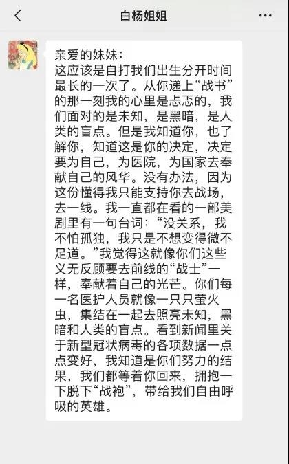 陽光總在風(fēng)雨后,我們大家都堅定信心,有祖國做我們的強(qiáng)大后盾,有全國醫(yī)護(hù)人員的齊心協(xié)力、同舟共濟(jì),相信我們一定能打贏這場戰(zhàn)役,春暖花開之日我們再見!