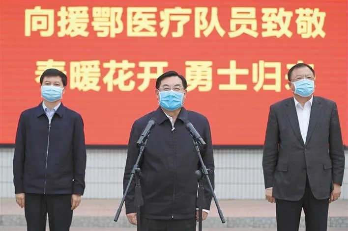 胡和平代表省委、省政府和全省人民,歡迎白衣戰(zhàn)士們平安凱旋,向仍然堅守在湖北的醫(yī)療隊員表示誠摯慰問,向醫(yī)務(wù)人員家屬的理解和支持表示衷心感謝。胡和平指出,習(xí)近平總書記十分關(guān)心關(guān)愛一線醫(yī)務(wù)人員,黨中央、國務(wù)院作出了一系列安排。希望大家在接下來的這段時間里安心休養(yǎng),調(diào)整好身心和精神狀態(tài)。休整結(jié)束后,要繼續(xù)保持在這次抗疫戰(zhàn)斗中展現(xiàn)出的良好精神風(fēng)貌,立足崗位、努力工作,為奪取疫情防控和實現(xiàn)經(jīng)濟(jì)社會發(fā)展目標(biāo)任務(wù)雙勝利再立新功。
