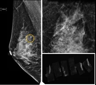 46歲的某女士在西安國際醫(yī)學中心醫(yī)院體檢時,行乳腺X線攝影(俗稱鉬靶)發(fā)現(xiàn)右乳可疑簇狀鈣化,分布范圍不到1厘米,臨床觸不到,超聲很難發(fā)現(xiàn),但是這種鈣化風險比較高,依據(jù)國際BI-RADS指南需要明確病理!