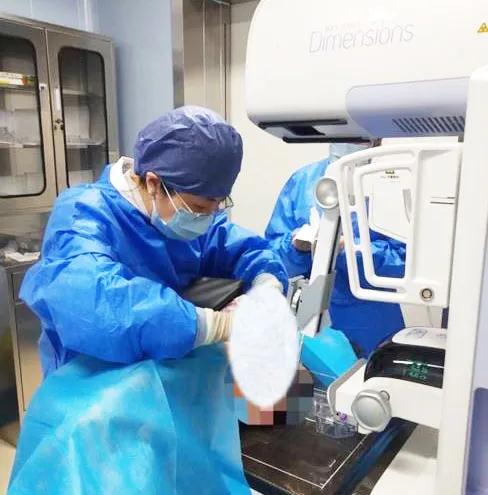 西安國際醫(yī)學中心醫(yī)院影像診療中心陳寶瑩副主任帶領的團隊,采用全數(shù)字化乳腺X線三維立體定位系統(tǒng)可實施。這個團隊的成員大部分來自知名三甲醫(yī)院,有著十余年影像引導下乳腺介入診療的經(jīng)驗,X線引導穿刺定位和活檢例數(shù)居西北前列。為減少患者創(chuàng)傷,在詳細判讀了患者資料,并與患者及甲乳外科劉曉敏主任充分溝通的基礎上,團隊確定采用全數(shù)字化乳腺X線三維立體定位系統(tǒng)下實施粗針活檢。