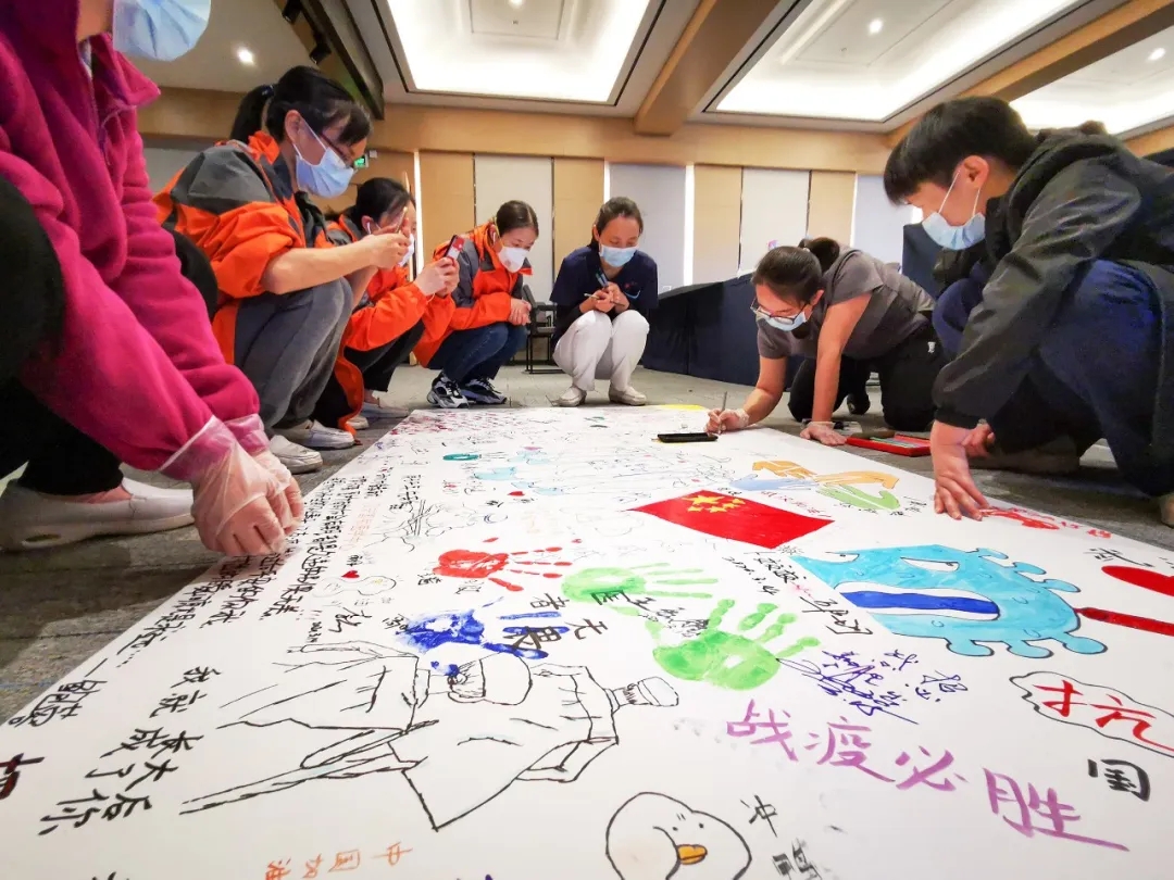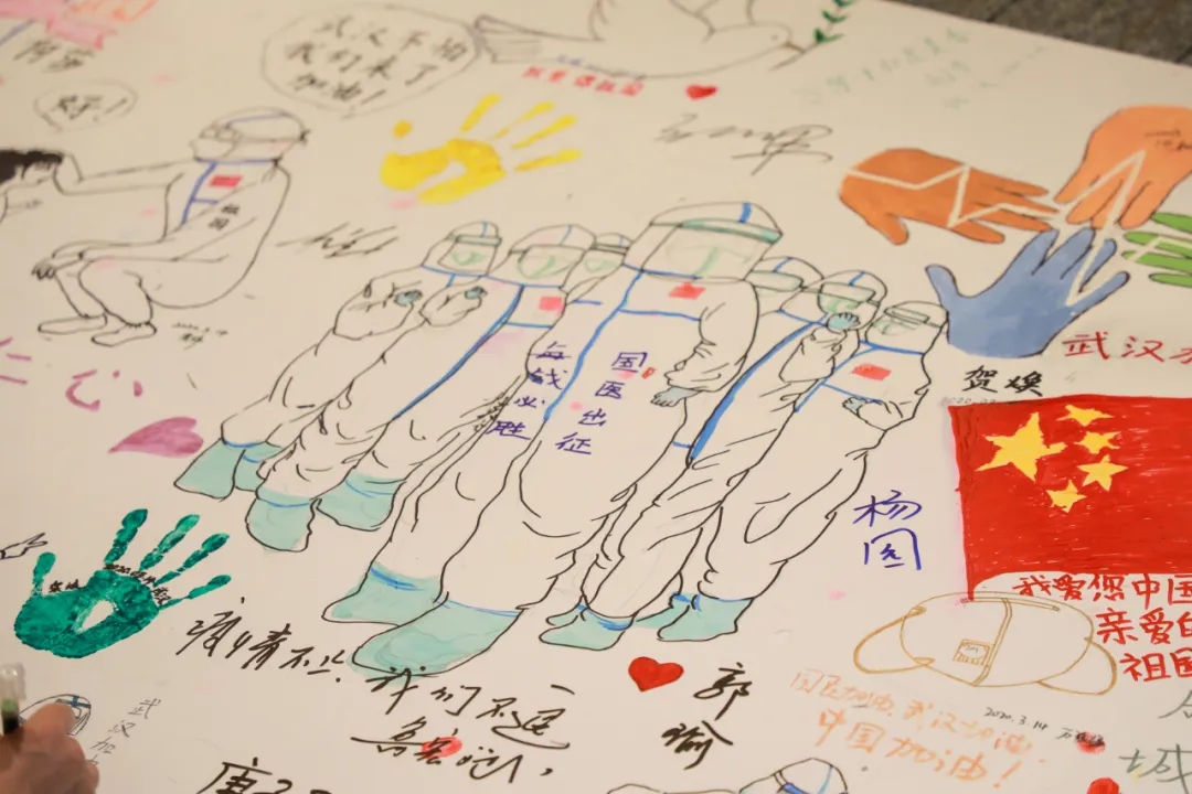 這兩幅畫板由醫(yī)療隊(duì)員和駐地的志愿者共同創(chuàng)作,一支支畫筆繪出全體人員戰(zhàn)“疫”祝福心聲:“武漢加油,中國(guó)必勝?!?/span>