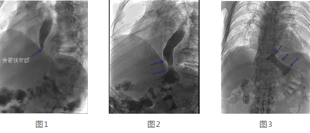在韓國宏教授的帶領(lǐng)下,專家團(tuán)隊(duì)經(jīng)多方面評估后,決定在DSA下為劉大爺行食管造影 食管支架置入術(shù)。術(shù)中透視可見食管中上段擴(kuò)張明顯,食管下端賁門口明顯狹窄,造影劑淤積,呈線性緩慢進(jìn)入胃腔(見圖1),經(jīng)過準(zhǔn)確定位后,釋放食管支架,再次造影可見造影劑經(jīng)支架順利進(jìn)入胃腔(見圖2)。2天后再次造影見食管支架完全打開,位置正常,造影劑可順利通過支架(見圖3)。