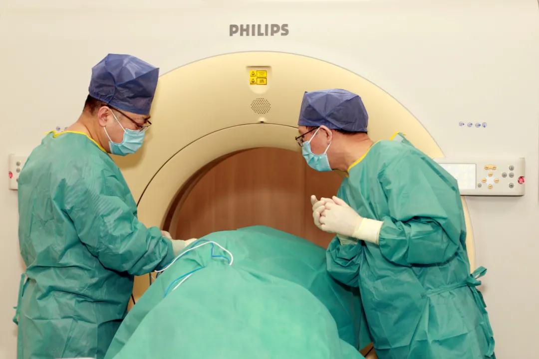 經(jīng)過放射治療中心陸軍主任的細(xì)致準(zhǔn)備與精準(zhǔn)定位,屈女士的射頻治療開始了?;颊卟扇∽髠?cè)臥位,麻醉醫(yī)生立即進(jìn)行靜脈全麻。在CT引導(dǎo)下,醫(yī)生手中的“消融針”,按照既定路線“穿引”,快速、準(zhǔn)確地插入右肺病灶部位,啟動射頻機(jī)器進(jìn)行了精準(zhǔn)的消融,右肺局部癌細(xì)胞一下子就被超高溫成功滅活了!經(jīng)CT掃查,無血氣胸;患者生命體征平穩(wěn)。2個小時后,屈女士就下地活動了。