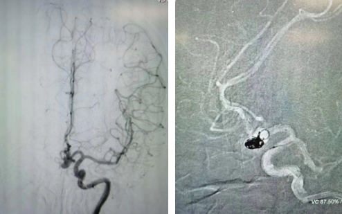 腦血管較外周血管更為脆弱、迂曲,對術(shù)者的操作技術(shù)及精準(zhǔn)性要求特別高。術(shù)中,陸丹醫(yī)生通過股動脈穿刺、置入微導(dǎo)管,再通過微導(dǎo)管將彈簧圏送入動脈瘤腔內(nèi),利用彈簧圈的機械閉塞作用,達(dá)到防止動脈瘤破裂的目的。術(shù)后,患者各項生命體征平穩(wěn)。