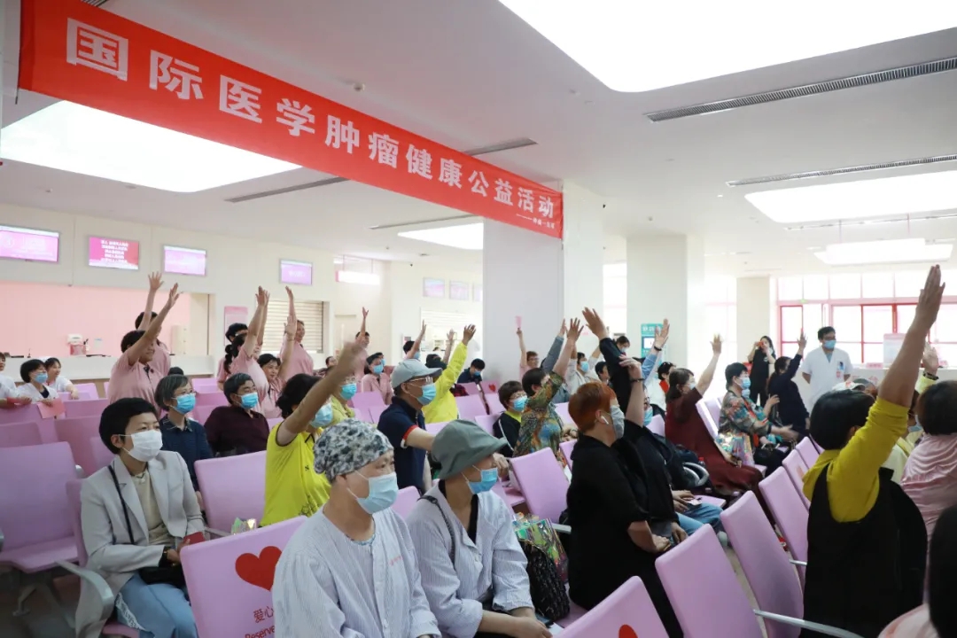 腫瘤一病區(qū)的醫(yī)護(hù)人員和志愿者們共同演練了一段八段錦,隨后的健康知識問答和歌曲快閃環(huán)節(jié)將活動氛圍推向高潮,大家爭先恐后地舉手搶答,現(xiàn)場問答也促進(jìn)了對于腫瘤防治、康復(fù)知識的推廣。最后,大家合唱歌曲“相信我們會創(chuàng)造奇跡”,積極、歡樂的氛圍縈繞不息?;顒幼詈?,薛妍副院長、劉樹松教授和張俊美醫(yī)生對患者的提問進(jìn)行了耐心、細(xì)致的解答。