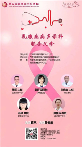 為方便患者就醫(yī),提高群眾乳腺健康意識,由西安國際醫(yī)學(xué)中心醫(yī)院腫瘤醫(yī)院、甲乳外科、放射治療中心、影像診療中心、超聲診療中心多位知名專家組成團(tuán)隊(duì),為廣大乳腺疾病患者提供全面、專業(yè)及個(gè)體化診療,并提供免費(fèi)乳腺超聲和骨密度檢查,歡迎掃碼報(bào)名。