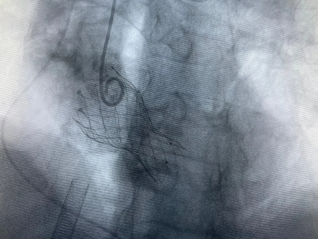 結(jié)合老人病情特點:年齡高、室壁厚、左室腔小、瓣膜鈣化嚴重,術(shù)中球囊擴張和瓣膜釋放過程有循環(huán)崩潰可能;為降低此種風險、最大程度提高手術(shù)成功率,張金洲副院長在術(shù)前組織了由楊金保博士帶領(lǐng)的TAVR團隊多次反復溝通、討論,制定了各種應(yīng)急處理方案。最終經(jīng)過TAVR團隊的默契配合,手術(shù)歷時2小時,用20#球囊預(yù)擴張后順利植入23#主動脈瓣生物瓣膜,再次后擴后主動脈根部造影顯示:人工主動脈瓣生物瓣位置良好,瓣葉開閉正常;冠脈顯影良好。經(jīng)食道超聲顯示:主動脈瓣葉活動度良好,主動脈跨瓣壓差約35mmHg,未見瓣周漏及明顯返流。出手術(shù)室前老人便已蘇醒,自訴憋悶癥狀完全消失。