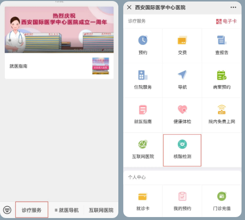 醫(yī)院核酸檢測已開通線上預(yù)約,大家可通過“西安國際醫(yī)學中心醫(yī)院服務(wù)號”微信公眾號進行預(yù)約。