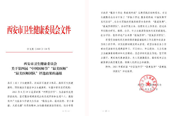 在中國醫(yī)師節(jié)到來之際,西安市衛(wèi)健委、高新區(qū)文旅健康局表彰了一批先進(jìn)醫(yī)療機構(gòu)、優(yōu)秀醫(yī)務(wù)工作者,西安國際醫(yī)學(xué)中心醫(yī)院3個科室、6名醫(yī)生獲得表彰。