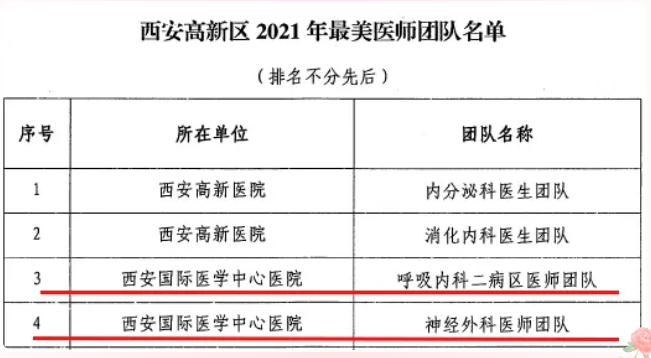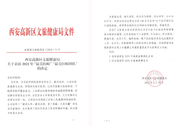 西安高新區(qū)文旅健康局表彰了西安高新區(qū)2021年最美醫(yī)師團(tuán)隊、最美醫(yī)師。呼吸內(nèi)科二病區(qū)醫(yī)師團(tuán)隊、神經(jīng)外科醫(yī)師團(tuán)隊榮獲西安高新區(qū)2021年最美醫(yī)師團(tuán)隊,董文婷、常亮、楊磊、張安生榮獲西安高新區(qū)2021年最美醫(yī)師。