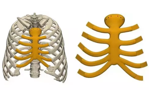 由于惡性腫瘤已經(jīng)侵蝕患者胸骨,且患者既往縱劈胸骨手術(shù),手術(shù)中不得不行全胸骨切除置換,因此需要使用人工胸壁置換術(shù)。西安國際醫(yī)學(xué)中心醫(yī)院打破傳統(tǒng)植入方式,通過分析患者增強(qiáng)CT掃描資料,計(jì)算出腫瘤大小,切除范圍及切除后需要植入材料的大小形狀,并通過3D打印技術(shù)制作出和患者解剖結(jié)構(gòu)完全相同的植入材料,植入物采用國際上先進(jìn)的聚醚醚酮(PEEK)材料,其力學(xué)結(jié)構(gòu)接近人體皮質(zhì)骨,具有重塑胸壁力學(xué)的顯著特性。由此來制作人工胸廓替代胸骨和部分肋骨。