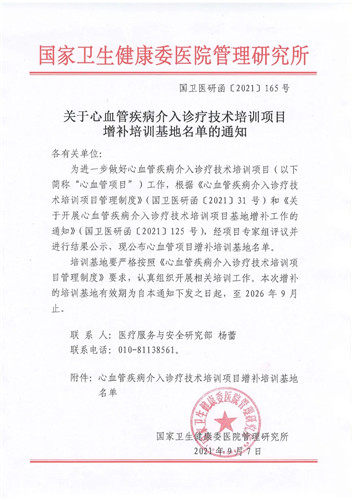 9月7日,在國家衛(wèi)生健康委醫(yī)院管理研究所發(fā)布的《關于心血管疾病介入診療技術培訓項目增補培訓基地名單的通知》中,西安國際醫(yī)學中心醫(yī)院榜上有名,這標志著我院已成功躋身于國家級心血管疾病介入診療醫(yī)療機構(gòu)行列,同時也標志著我院成為陜西省冠心病介入培訓基地之一,肩負心血管介入醫(yī)師的規(guī)范化培訓的使命,造福更多的心血管疾病患者。