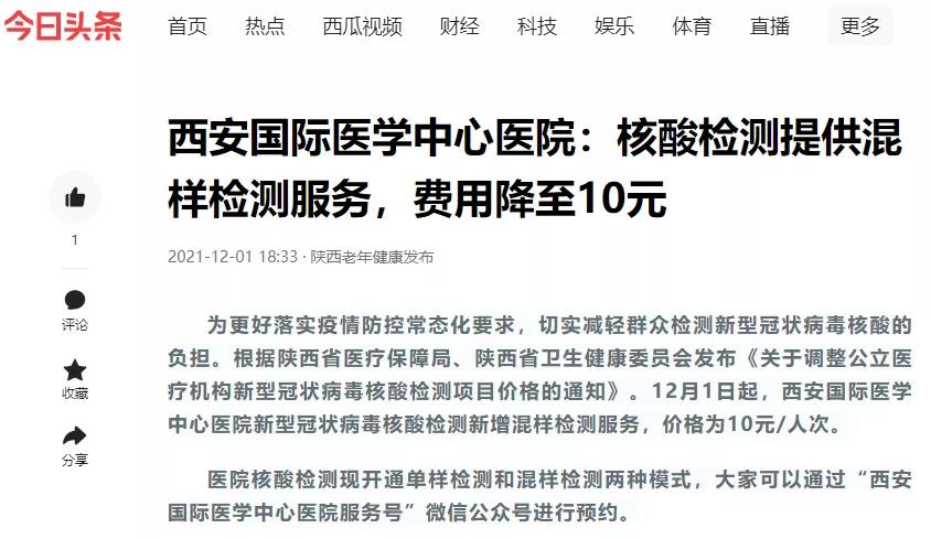 西安國際醫(yī)學中心醫(yī)院:核酸檢測提供混樣檢測服務,費用降至10元