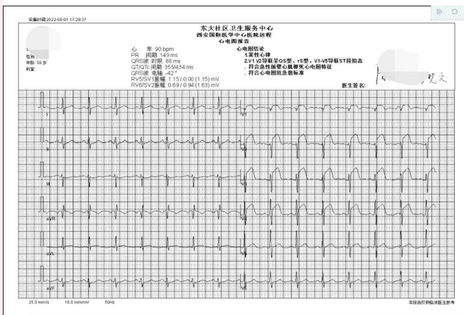 56歲的陳先生,因胸部燒灼感,胸部不適到東大社區(qū)衛(wèi)生服務(wù)中心就診?!翱紤]到疼痛區(qū)域在胸部,值班醫(yī)生張敏利做了急診心電圖,上傳西安國際醫(yī)學(xué)中心醫(yī)院遠(yuǎn)程心電診斷中心,網(wǎng)上遠(yuǎn)程心電圖2分鐘后反饋:結(jié)合患者癥狀,心電圖特征提示急性前壁心梗心電圖表現(xiàn),報(bào)危急值?!?