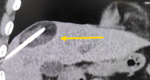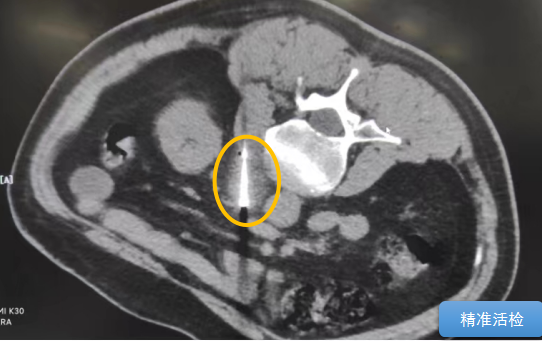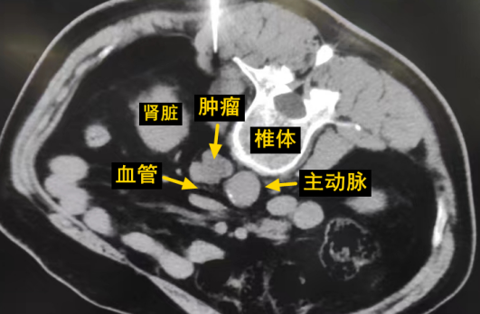 經(jīng)過(guò)多學(xué)科討論,陳寶瑩主任根據(jù)影像資料指出,患者轉(zhuǎn)移瘤位于腹膜后,內(nèi)側(cè)瀕臨人體最大的血管——主動(dòng)脈;前方同樣有血管緊貼腫瘤;外側(cè)是腎臟,后方是椎體和神經(jīng),夾縫中進(jìn)針難度大,治療時(shí)要避免周?chē)匾K器、血管和神經(jīng)的損傷,因此可以選擇CT引導(dǎo)下精準(zhǔn)穿刺活檢同步冷凍消融治療,即獲得病理組織有利于下一步全身治療方案的調(diào)整,同時(shí)殺死腹膜后轉(zhuǎn)移瘤,周?chē)=M織損傷的可能性也小。